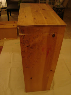 Here's the old dresser I brought from my parent's home. About 30 years old, red crayon drawings, pen markings, dark water stains on the top...